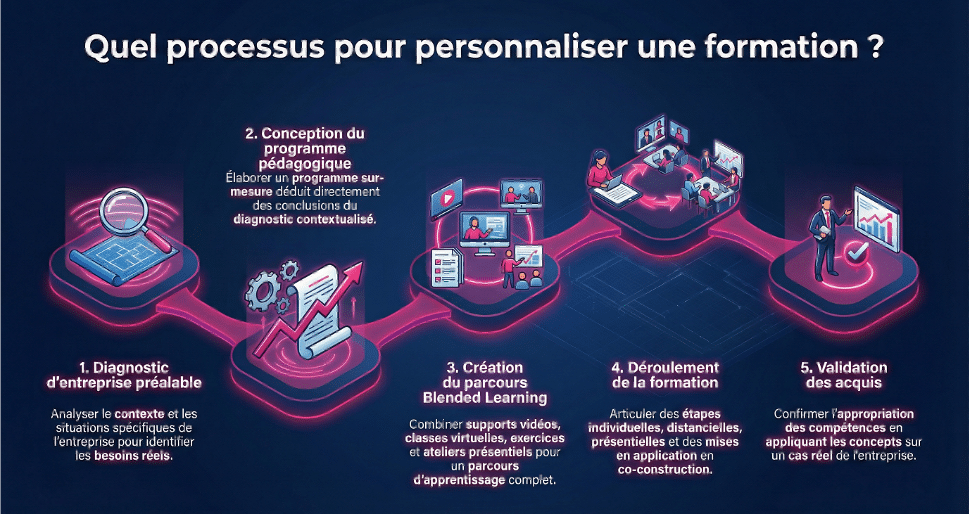 Notre processus de personnalisation est rigoureux et centré sur la réalité de votre entreprise. Il se décompose en trois étapes clés pour garantir une adéquation parfaite entre vos besoins et les compétences développées.